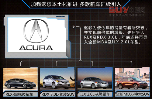謳歌為使今年的銷量有著所突破,以實現翻倍式的增長目標。謳歌已在華陸續引入旗艦級豪華轎車RLX,推出搭載小排量發動機的緊湊型豪華SUV-RDX。隨后在今年年底全新一代旗艦SUV車型MDX也將導入中國,緊湊型豪華轎車ILX 2.0L車型的導入,從而實現謳歌在華產品的全面升級和換代,并加速進口車型全面實現小排量化,以提升旗下產品的競爭力。