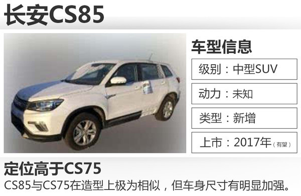 通過此前的消息,CS85或?qū)⒒贑S75的平臺(tái)研發(fā)。從曝光額諜照來看,CS85與CS75在造型上極為相似,但車身尺寸與軸距有明顯加強(qiáng)。而從命名來看,CS85的定位也將高于CS75,并成為長(zhǎng)安汽車“偶數(shù)”戰(zhàn)略中又一員“大將”。