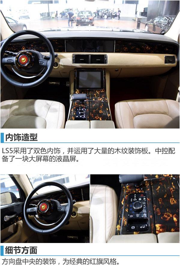LS5采用了雙色內飾,并運用了大量的木紋裝飾板。新車的雙幅式方向盤和中控看起來簡潔,明了。大面積的直線設計使得該車顯得異常大氣、穩重。方向盤中央的裝飾,也是經典的紅旗風格。新車采用了4.0升雙渦輪增壓發動機,匹配8速手自一體變速箱。0-100km/h的加速時間為8.2秒,最高時速220km/h。