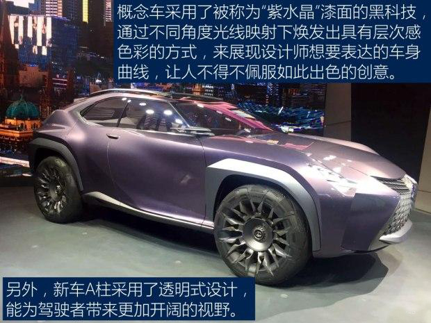 外觀方面,UX概念車使用“紫水晶”漆面,而造型采用了家族化設(shè)計(jì),整體線條的力量感和設(shè)計(jì)感都很強(qiáng)。透明的A柱設(shè)計(jì)使整車的亮點(diǎn)所在,可以為駕駛者帶來(lái)更開(kāi)闊的視野。此外,21英寸的密條輻式輪圈采用了與輪胎花紋相融合的紋路設(shè)計(jì),樣式非常新穎。