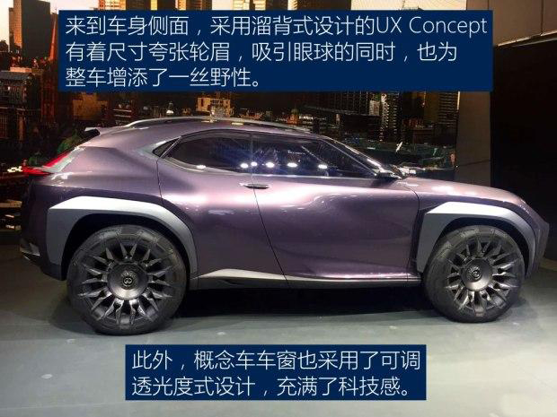 車尾部分,整體呈“U”形的LED尾燈與后風(fēng)擋玻璃相接,車尾下部線條復(fù)雜多變,富有層次感,而下方則是雙邊共兩出式排氣口布局。此外,UX概念車還采用了一系列電子科技,如透光度可調(diào)式車窗、取代了傳統(tǒng)外后視鏡的電子攝像頭等。
