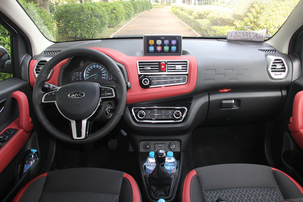 江淮瑞風S2 MINI內飾設計主題以黑色和紅色的配色為主題,并采用了大量的鍍鉻飾條進行修飾。中控面板的設計稍偏向駕駛員一側,整體的設計也是十分的簡潔時尚。方向盤采用了皮質材料包裹,中間采用了亮黑色的鋼琴烤漆和鍍鉻飾條進行修飾,整體看上去很有質感。