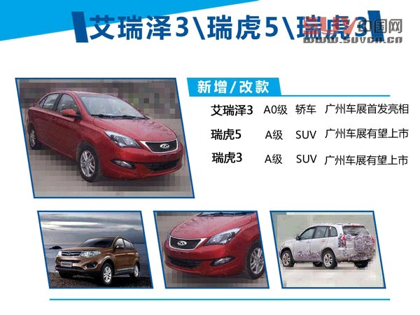 SUV中國網報道 今年4月份奇瑞發布了“技術奇瑞”品牌發展戰略和全新的iAUTO平臺,隨后作為奇瑞iAUTO平臺首款車型艾瑞澤7正式上市。伴隨新的品牌發展戰略,奇瑞還將于下月廣州車展期間推出三款新車,其中包含兩款SUV車型。近日,SUV中國網通過走訪北京地區多家奇瑞汽車經銷商獲悉:在11月22日廣州車展期間奇瑞iAUTO平臺將推出艾瑞澤3和瑞虎5兩款新車,此外中期改款車型瑞虎3也將同時推出。