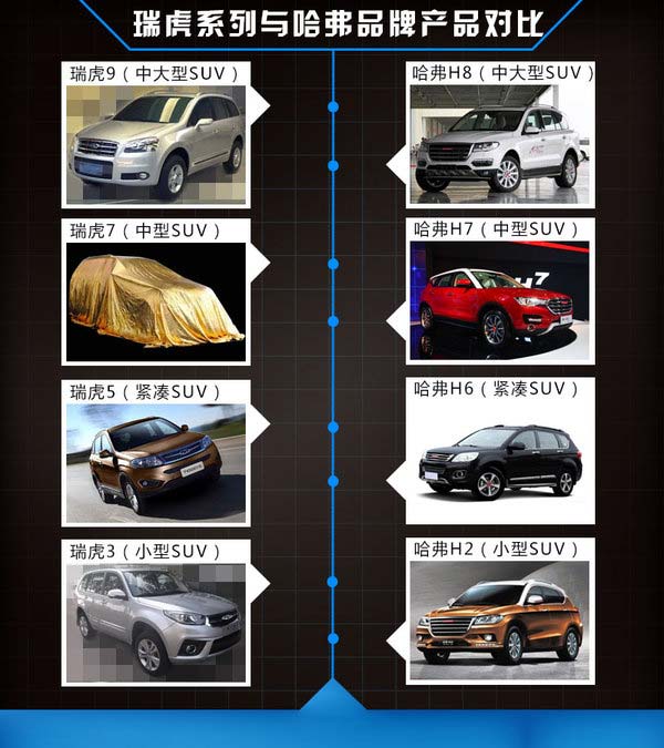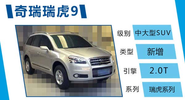 2013年10月30日,奇瑞旗下第二款SUV瑞虎5正式下線,該車定位于緊湊SUV,未來奇瑞還將推出涉足更高領域的SUV車型來提升其品牌影響力。網通社近日獲得了一組疑似奇瑞大型SUV的諜照,此外,奇瑞汽車內部人士向網通社透露:“在瑞虎品牌下,未來還會有瑞虎7、瑞虎9產品”。在動力系統方面,瑞虎9未來有望搭載奇瑞自主研發的2.0T渦輪增壓發動機,新車推出后將與哈弗H8展開競爭。