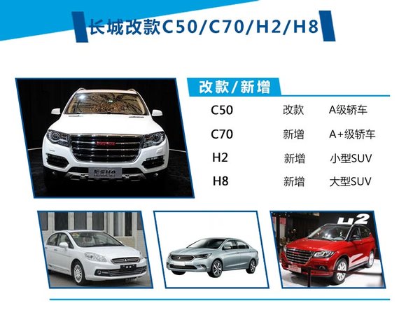 長城汽車不僅專注于SUV領域,轎車同樣是長城重要的銷量增長點。據其官方發布的數據,今年前10月累計銷量達61.9萬輛,同比增長27.8%。在公司看來,這樣的數據也僅僅基本符合預期。長城汽車董事長魏建軍先生在接受媒體采訪時曾表示:“在轎車方面,我們目前只想把A級車做強做好;而在SUV領域,未來哈弗品牌將實現從H2到H9的全系車型覆蓋。近日網通社通過長城內部人士了解到:其有望在本月推出4款車型,除了C50屬于改款車型,其他三款C70、H2和H8均為新增產品。