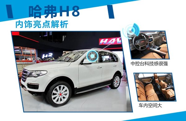 哈弗H8是哈弗品牌獨立之后打造的首款中高端SUV車型,將于廣州車展正式上市,售價區間為20萬—25萬元。動力方面,其搭載2.0T渦輪增壓缸內燃油直噴發動機,匹配ZF 6速手自一體變速箱。此外,哈弗H8也是在長城汽車與哈曼中國簽署戰略合作協議后,首款搭載Infinity品牌高端汽車音響的長城車型,這也是長城走向國際化的一個標志。