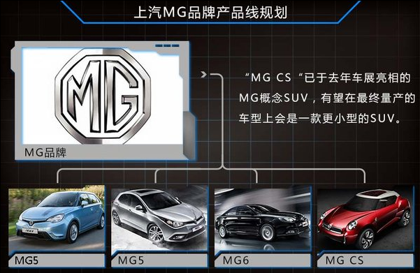 上汽旗下榮威與MG兩大品牌目前采用了分網(wǎng)營銷的新方式,而MG品牌目前推出的僅有3款轎車,分別為MG3、 MG5以及MG6三款車型。另外,此前上汽官方曾宣布將在明年四季度推出首款小型SUV車型,并有望于明年正式量產(chǎn),也就是去年車展亮相的MG概念SUV,并有望在最終量產(chǎn)的車型上會(huì)是一款更小型的SUV。