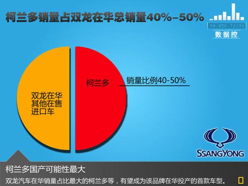 根據外資車企在華的國產慣例,在華銷量占比最大的產品,通常便是首款國產車型。今年1-8月雙龍汽車在華銷量突破7,800輛,相比2012年不足3,000臺的銷量,雙龍汽車有著翻倍的增長,其中柯蘭多的單車銷量已占雙龍在華總銷量的40%-50%。對于柯蘭多所創造的成績,讓這款車型的國產有著極大可能性。