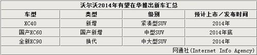 2013年前11月,沃爾沃已在華累計銷售54,461輛新車,同比增長約44.7%,其中包括全新V40以及S60L等車型的貢獻功不可沒。中國作為沃爾沃最重要的市場之一,為保持目前銷量的進一步提升,對于未來的新車規劃,沃爾沃汽車集團總裁兼CEO漢肯?薩繆爾森此前表示:沃爾沃計劃到2015年期間推出9款全新或改款車型,不僅是XC60,還有XC90,這些都是我們考慮未來要在中國傾斜更多資源的車型。其中2014年該品牌有望在華引入XC40和XC90兩款SUV車型外,目前以進口形式銷售的中型SUV——XC60也將于今年在華實現國產。