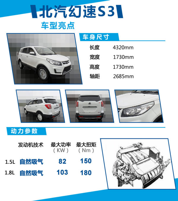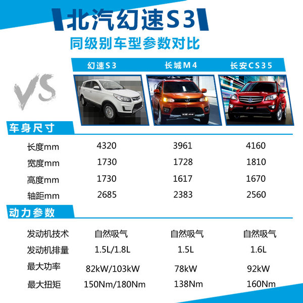 動力方面,S3將搭載1.5L、1.8L兩款自然吸氣發(fā)動機(jī)。其中1.5L發(fā)動機(jī)最大功率82kW,峰值扭矩為150Nm;1.8L發(fā)動機(jī)最大功率103kW,峰值扭矩為180Nm,與之匹配的是一臺5速手動變速箱。去年,長安CS35以7.5萬的銷量排登上小型SUV銷量冠軍寶座,S3上市后將與其展開交鋒。從車身尺寸和動力上看,幻速S3均有優(yōu)勢,上市后有望打破現(xiàn)有小型SUV的市場格局,成為北汽又一款熱銷車型。
