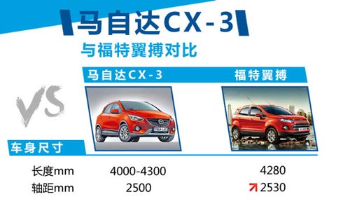 作為小型SUV,CX-3的車身長度將超過4000mm,但會控制在4300mm以內,軸距在2500mm左右。外觀采用馬自達家族最新的“魂動”設計理念,全新的家族式進氣格柵設計,整體偏向年輕運動的風格,其中車身特征線條會很有特點。此外該車也非常強調實用性表現,車內將配備后排座椅一鍵式放倒等實用性功能。新車同級別的車型競爭還包括福特小型SUV翼搏、日產Juke、別克昂科拉等車型。
