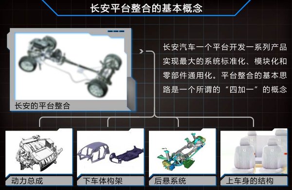 長安乘用車正在著力研發平臺整合的基本思路稱之為“四加一”概念,最終實現標準化、模塊化和零部件通用化。長安汽車工程研究院常務副院長李偉曾表示:做平臺化最核心的就是要零部件規?;?。首先發動機艙的標準化,其中包括能夠確定排量、功率的動力總成等。此外還有下車體、后懸系統的組合以及上車身的結構件,以實現平臺上大量零部件的共享。