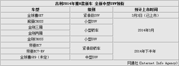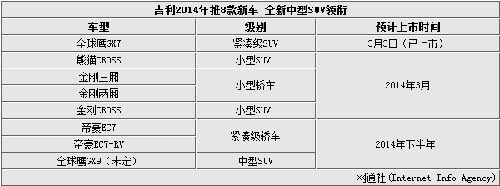 根據(jù)吉利汽車發(fā)布的公告,2013年其全年總銷量為54.9萬(wàn)輛,較2012年增長(zhǎng)14%。公司今年的目標(biāo)銷量是58萬(wàn)輛,較去年增長(zhǎng)約6%。相比之下,吉利今年新車的投放力度則更為強(qiáng)勁。近日,吉利旗下主力車型全球鷹GX7的2014款在海南正式發(fā)布上市,然而這僅僅只是一個(gè)開(kāi)始。對(duì)于今年的新車計(jì)劃,吉利控股集團(tuán)有限公司公關(guān)總監(jiān)楊學(xué)良近日在接受記者采訪時(shí)表示:“今年,吉利將推出8款新車,包括一款比GX7更大的SUV,有望于今年下半年上市銷售”。這意味著,除了剛上市的新款GX7,今年吉利還將有7款新車將上市。