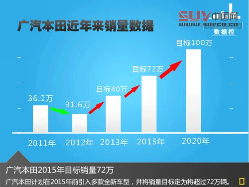 在多款車型與全新技術發布后,廣汽本田也將扭轉銷量下降的局面,擺脫“釣魚島事件”的困擾,在今年實現銷量提升。廣汽本田前任執行副總經理姚一鳴曾在此前表示,今年廣汽本田將實現銷量增長30%,有望達到40萬輛。而廣本的2015年銷量目標將超過72萬輛,新車的引入與全新引擎技術將帶動廣汽本田銷量的提升。