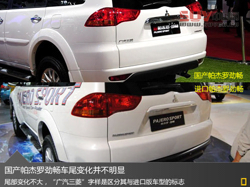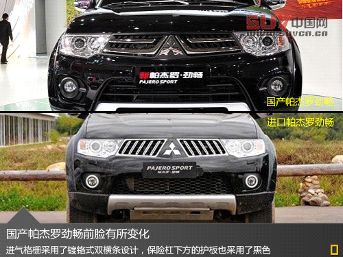 不同于帕杰羅原車型的外觀設計,帕杰羅勁暢在外觀上更顯動感犀利,國產后的帕杰羅勁暢還將在外觀上做出進一定的調整。與進口車型相比,國產勁暢的進氣格柵采用了鍍鉻式雙橫條設計,而在保險杠下方的護板也采用了黑色;尾部變化不大,“廣汽三菱”字樣是區分其與進口版車型的標志。