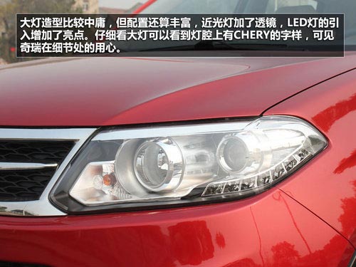 大燈造型比較中庸,但配置還算豐富,近光燈加了透鏡,LED燈的引入增加了亮點。仔細看大燈可以看到燈腔上有CHERY的字樣,可見奇瑞在細節處的用心。