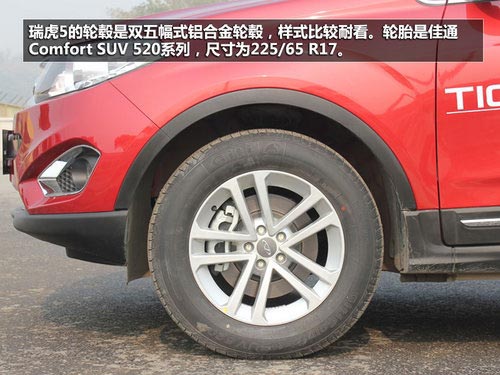 瑞虎5的輪轂是雙五幅式鋁合金輪轂,樣式比較耐看。輪胎是佳通 Comfort SUV 520系列,尺寸為225/65 R17。
