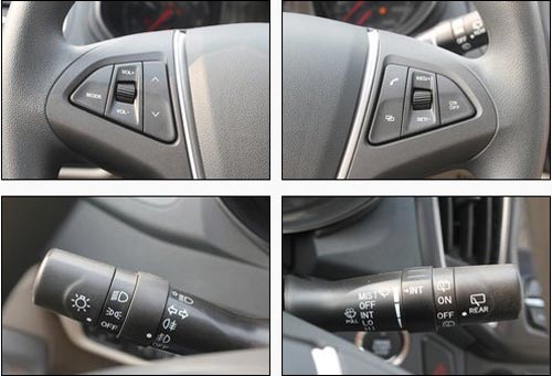 樣式普通三幅式多功能方向盤,有銀色飾條的點綴,看起來不會太單調、呆板。方向盤左邊按鍵用來調節音響,右邊則是控制藍牙電話和定速巡航。