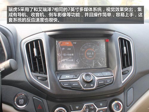 瑞虎5采用了和艾瑞澤7相同的7英寸多媒體系統,視覺效果突出,集成有導航、收音機、倒車影像等功能,并且操作簡單,容易上手,這套系統的反應速度也很快。