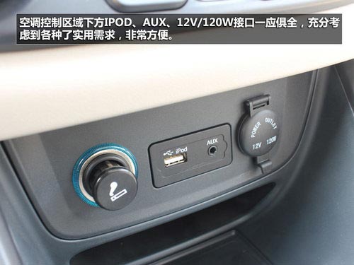 空調控制區域下方IPOD、AUX、12V/120W接口一應俱全,充分考慮了實用需求,非常方便。