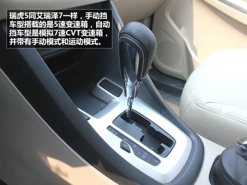 瑞虎5同艾瑞澤7一樣,手動擋車型搭載的是5速變速箱,自動擋車型是模擬7速CVT變速箱,并帶有手動模式以及運動模式。
