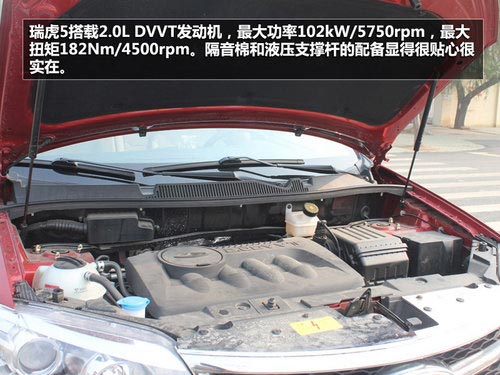 瑞虎5搭載2.0L DVVT發動機,最大功率102kW/5750rpm,最大扭矩182Nm/4500rpm。隔音棉和液壓支撐桿的配備顯得很用心很實在。