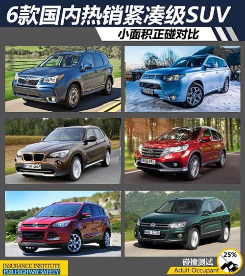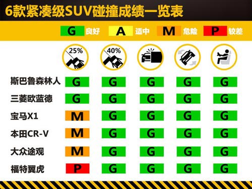我們這次選擇的SUV車型分別為:斯巴魯森林人、三菱歐藍德、寶馬X1、本田CR-V、大眾途觀以及福特翼虎。從IIHS公布的小面積碰撞測試總體評價來看,6款車中只有森林人和歐藍德取得了良好的成績,翼虎成績則是最低級別的“P”(較差)。其余3款車的總體評價一致,均為“M”(危險)。需要指出的是,除嚴苛的小面積測試之外,各車在40%正面碰撞、側面碰撞、頂部碰撞和頸部保護這4大項測試中均取得了良好的成績。
