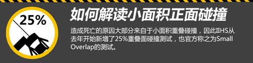 小面積碰撞受測車輛以時速40英里(約64km/h)的速度,用車輛前端駕駛員一側大約車寬25%的面積撞擊一個5英尺高的剛性障礙壁。由于避開了主要的正面吸能區域,所以前部測車架幾乎吸收不到碰撞能量,障礙物會撞到駕駛室上。導致車輪更易侵入駕駛艙以及轉向柱儀表盤等部件更容易移位。在同等速度下,25%偏置正面碰撞比40%偏置正面碰撞,對車內乘員造成的傷害嚴重得多,對駕駛艙要求的強度也要遠遠高于40%偏置碰撞。