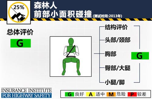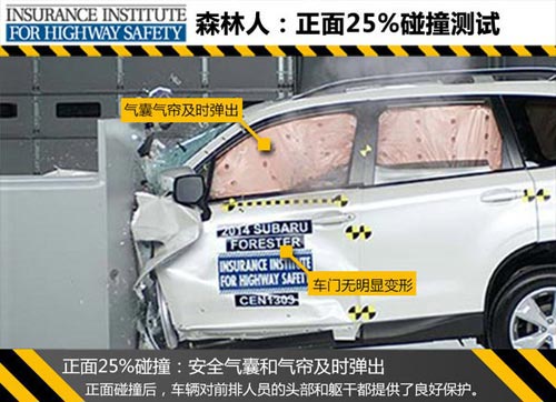 在最嚴苛的正面25%碰撞測試中,森林人的發動機艙吸收大部分能量而潰縮,碰撞后車輛A柱及車門均未出現明顯變形,車門邊框及部件沒有斷裂入侵車內,駕駛員的生存空間保持良好。安全氣囊和側氣簾及時彈出,對乘員頭部起到充分保護作用,同時身軀各部位均得到有效保護。斯巴魯森林人在小面積碰撞測試中的車身結構安全和車內人員安全每一項成績均為“G”(良好),安全性優于同級別車型。