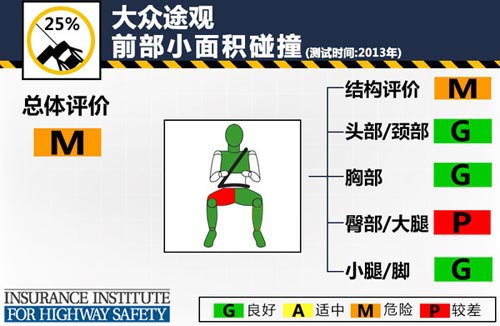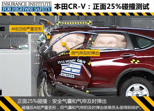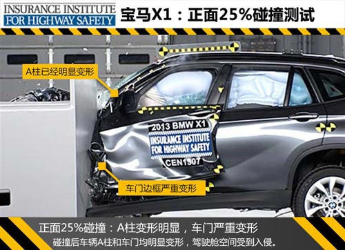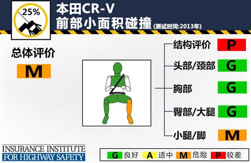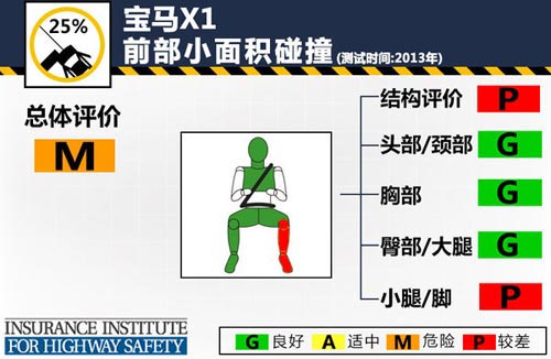寶馬X1、本田CR-V和大眾途觀在小面積碰撞測試中總體評價也不理想,均取得了“M”(危險)的一致成績。但這3款SUV的車身結構安全項和車內乘員安全項的成績卻各不相同。車身結構方面,X1和CR-V的成績最低,均為“P”(較差),碰撞后2車發動機艙雖然吸收了大部分能量,但A柱和車門均變形較為嚴重,駕駛艙空間還是受到了入侵。途觀這項成績則稍高于2車。在對車內乘員保護方面,3車對車內乘員的頭部保護都比較到位。但由于碰撞后駕駛員生存空間受到儀表板和鉸鏈柱等部件不同程度的入侵,3款SUV車內乘員身體都有不同部位的受到傷害風險。途觀車內模擬駕駛員假人的左側臀部有受到傷害的風險;CR-V車內模擬駕駛人假人的左側小腿有受到傷害的風險;而寶馬X1的模擬假人則是左側小腿和腳有受到傷害的風險。