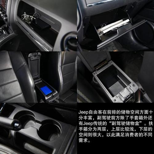 Jeep自由客在前排的儲(chǔ)物空間方面十分豐富,副駕駛前方除了手套箱外還有Jeep傳統(tǒng)的"副駕駛儲(chǔ)物盒",在這里可以存放手機(jī)、錢包等小件物品。扶手箱分為兩層,上層比較淺,下層的空間則很大,以此滿足消費(fèi)者的不同需求。