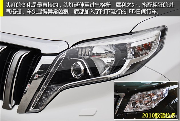 Prado作為陸地巡洋艦的分支,出色的越野性能、易保養和高穩定性受到廣大越野愛好者的喜愛。2009年第四代Prado被引入中國,2.7L車型為原裝進口,4.0L車型在四川豐田生產。目前的2014款普拉多 屬于中期改款,集中變化在外觀及內飾上。成都一汽豐田4S店,現車均已到店,今天我們就一起來看看新普拉多都有哪些改變,拍攝車型國產普拉多4.0LV6 VX。
