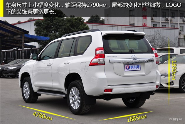 新普拉多在車身尺寸上變化極小,長/寬/高:4780/1885/1890mm,軸距保持2790mm。比對手三菱帕杰羅 稍小些,不過更顯緊湊。車身尾部的變化主要在尾燈上,總的來說,變化是非常細微的。