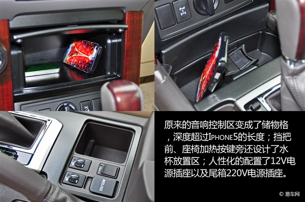 中央扶手下車載冰箱的空間比較大,目測可以放置4大瓶飲料,面上有一個制冷開關,與很多靠空調出風口降溫的車載冰箱不同,據了解普拉多的冰箱具有冰鎮效果,對于長途旅行,這樣一個大冰箱將非常實用。