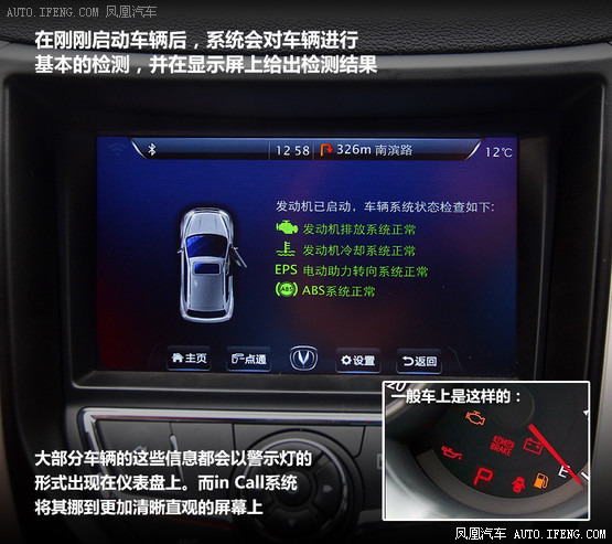 一般車輛上都能夠提供的功能這里就不再過(guò)多介紹了,我們主要來(lái)介紹一下in Call系統(tǒng)提供的一些比較獨(dú)特的功能。首先是車輛自檢功能,在剛剛啟動(dòng)車輛后,系統(tǒng)會(huì)對(duì)車輛進(jìn)行基本的檢測(cè),并在顯示屏上給出檢測(cè)結(jié)果。這個(gè)功能從本質(zhì)上說(shuō)并不是什么很先進(jìn)的東西,因?yàn)榇蟛糠周囕v的這些信息都會(huì)以警示燈的形式出現(xiàn)在儀表盤上。而in Call系統(tǒng)將其挪到更加清晰直觀的屏幕上,對(duì)于一些不太留意儀表盤的新手來(lái)說(shuō)會(huì)帶來(lái)更易懂的提示。