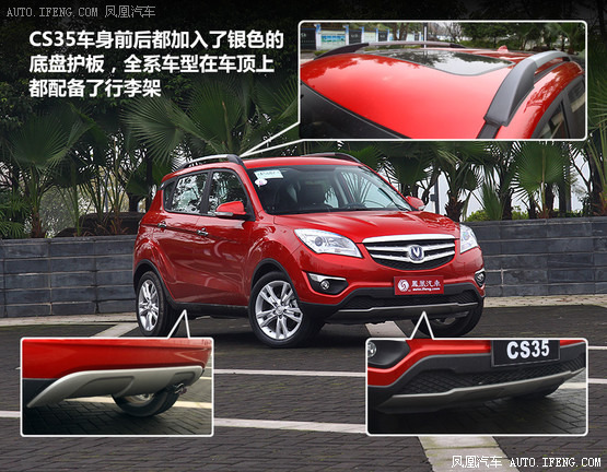 當(dāng)然,CS35上也加入了SUV獨(dú)有的設(shè)計(jì)元素,比如車身前后都加入了銀色的底盤護(hù)板,雖然城市SUV的實(shí)際意義不大,但是視覺(jué)感受上會(huì)顯得更有力量感。全系車型在車頂上都配備了行李架,這也是顯示SUV身份的重要元素。