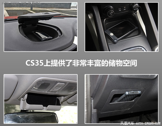 而CS35讓我最印象深刻的就是其非常豐富的儲(chǔ)物空間。一些常規(guī)的儲(chǔ)物盒已經(jīng)無(wú)需過(guò)多介紹,在方向盤左側(cè)、中控臺(tái)上方都也都提供了放置物品的地方。