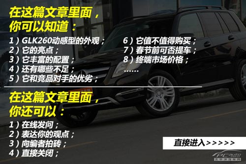 GLK260 4MATIC 動感型(下文簡稱“GLK260”)的出現,并不是單純地豐富產品線。更深層的意義相信大家看到它的售價已經明白——從競品手里搶回更多的客戶。既然能突破油耗這一大關,并且能把售價拉至“3字打頭”,其光芒已經慢慢逼近同級標桿Q5。到底它有多大的能耐?我們帶著很多的問題(問題見下)看下去。