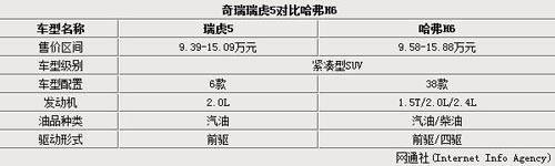 首先我們通過兩款車型的售價來看,均鎖定在9萬至16萬元的價格區間內,要說兩車針鋒相對也并不為過。其中瑞虎5提供有6款配置,分別提供有手動擋和自動擋車型。而哈弗H6在車型配置方面提供多達38款車型,給予消費者眾多的選擇空間,也有著很明顯的缺點,如何讓消費者在眾多車型中挑選出中意的配置,這將成為一件頗費周折的事情。