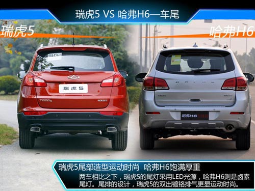 相比哈弗H6而言,瑞虎5的車尾造型顯得更為時尚動感,尾燈采用LED光源,配合雙出鍍鉻方形尾排,加之寬大的車身和黑色的下包圍,令整車顯得極具越野氣息。哈弗H6由于牌照框位置較低,令視覺中心向下延伸,整車造型看來更加厚重。