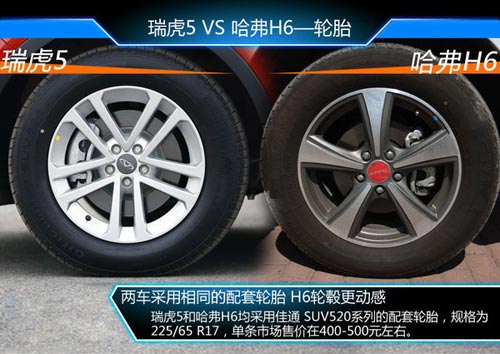 值得一提的是兩款SUV所匹配的是同一型號輪胎品牌和規格,均為佳通Comfort SUV520輪胎,規格為225/65 R17,市場售價在400至500元左右。唯一不同的便是輪轂造型,其中瑞虎5的輪輞更為張揚,而哈弗H6設計的更為動感。