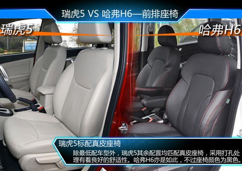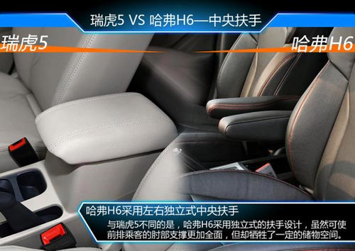 瑞虎5全系車型除低配版外,均配備有真皮座椅,整個坐墊及背部區域均采用打孔處理,有助于提升座椅的透氣性和舒適感。同時,兩款SUV均配備中央扶手,其中哈弗H6采用左右獨立式的扶手設計,雖然這一設計可給予前排乘客全面周到的肘部支撐,但是也犧牲了一定的儲物空間。