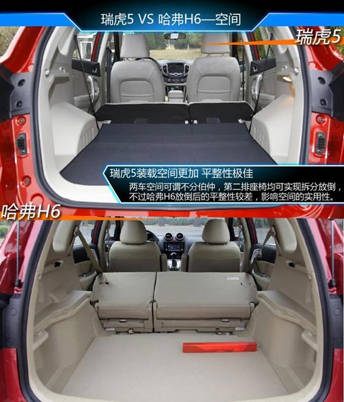 對于裝載空間上,瑞虎5和哈弗H6均可實現將第二排座椅進行放倒,從而拓展后備廂的容積。不過哈弗H6的座椅放倒后,并不能與地板形成完整的平面,車輛的平整性不及瑞虎5,一定程度上這也將影響整車的裝載能力。