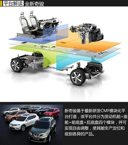 日產新一代奇駿是首批基于雷諾-日產聯盟最新研發的CMF(Common Module Family)模塊化平臺打造的車型,該平臺共分為發動機艙+座艙+前部底盤+后部底盤四個模塊,并可實現自由靈活調整,使其能生產定位和級別各異的產品。CMF平臺跳出傳統的汽車設計和制造理念,除全新一代奇駿外,包括逍客、軒逸等系列產品未來均有望采用該平臺打造。