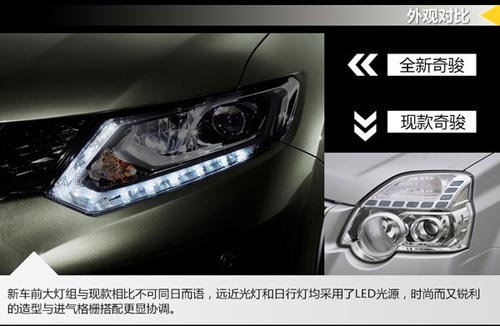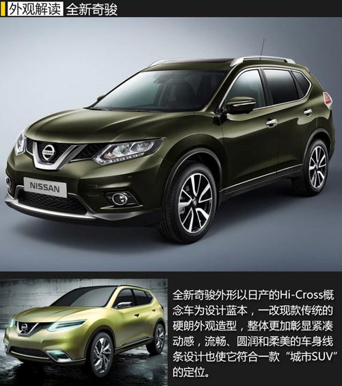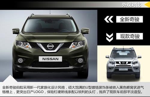 全新奇駿外形以日產的Hi-Cross概念車為設計藍本,不再延續現款車傳統的硬朗外觀造型,新車車身線條更加流暢、圓潤和柔美。前臉采用日產新一代家族化設計風格,碩大飽滿的U型鍍鉻裝飾條被嵌入黑色蜂窩狀進氣格柵上,看起來更加充滿質感。保險杠硬朗線條配以銳利的五邊形大燈組,拋棄了現款車前部平淡造型。