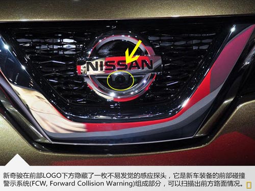 說到前大燈,國產全新奇駿將配備全LED大燈組。轉向燈、示寬燈、遠近光燈均引入LED光源,讓奇駿成為為數不多的大燈組全LED光源構成的車型。此外,新車在前臉LOGO下方隱藏了一枚不易發覺的感應探頭,它是在現款車的側可視系統基礎上,新增的FCW(Forward Collision Warning)前部碰撞警示系統的組成部分,可以掃描出前方路面情況之后通過車內顯示屏將信息通知駕駛員。