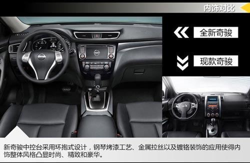 新一代奇駿的內飾采用了全新設計,整體感覺不再像老款車那樣保守單調。環抱式中控臺上鋼琴烤漆工藝、金屬拉絲以及鍍鉻裝飾得以應用,內飾整體風格凸顯時尚、精致和豪華。同時新車提供深淺兩種內飾顏色,深色內飾很有科技感和品質感,而淺色內飾則更顯溫馨,營造出不錯的居家感。