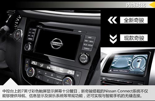 新奇駿的儀表由現款車型的平面設計改為采用炮筒式設計,更有運動風范,儀表盤中間大尺寸彩色行車電腦顯示屏,不僅可顯示行駛里程、油耗、溫度等常規信息,還可以顯示車道輔助,前車距離等信息。新奇駿將搭載最新Nissan Connect多媒體樂系統,這套系統除了能夠提供導航、信息顯示和娛樂等多種常規功能,也可實現與智能手機的無縫整合連接。此外,這套多媒體系統還支持藍牙通訊及USB、AUX-IN等多媒體擴充接口。