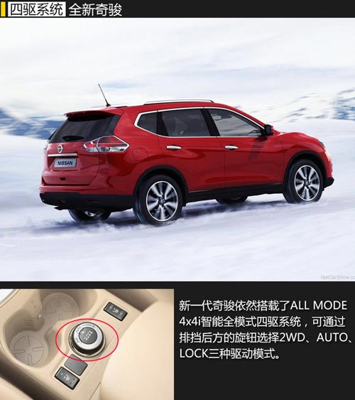 新一代奇駿繼續搭載日產的ALL MODE 4x4i智能全模式四驅系統,這套系統有兩驅模式、自動模式和四驅模式三種選擇。其中,兩驅模式適合正常公路行駛狀態;自動模式下,系統會感測油門開度、發動機轉速及扭矩輸出等信息,并根據這些信息自動調配出最優化的前后軸動力分配方案;而LOCK全時四驅模式下,新一代奇駿的越野優勢將得以發揮,前后車輪能以50:50的比例分配動力,再結合VDC系統(車輛動態控制系統)的制動來對輪間進行鎖止,以此幫助車輛順利通過復雜路況。在操作上,三種模式的切換可通過排擋后面的旋鈕輕松設置。