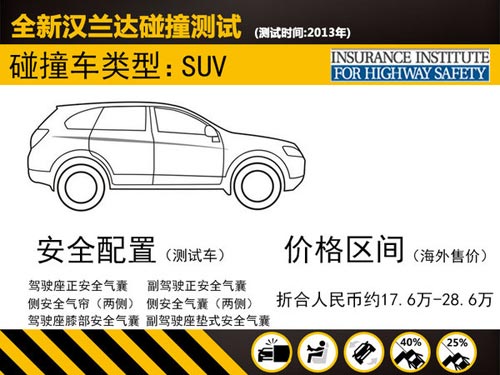 豐田2014年加大了在華新品投放力度,將有多款新車密集發(fā)布,其中就包括即將上市的全新漢蘭達(dá)。這款新車型剛剛在美國(guó)進(jìn)行碰撞測(cè)試并公布了成績(jī),網(wǎng)通社在經(jīng)過(guò)對(duì)測(cè)試數(shù)據(jù)的整理和分析后發(fā)現(xiàn)新車整體安全保護(hù)出色,特別是在最嚴(yán)苛的小面積測(cè)試中對(duì)車內(nèi)乘員的保護(hù)較為到位,下面就為大家解析一下這款全新SUV在碰撞測(cè)試中的表現(xiàn)。